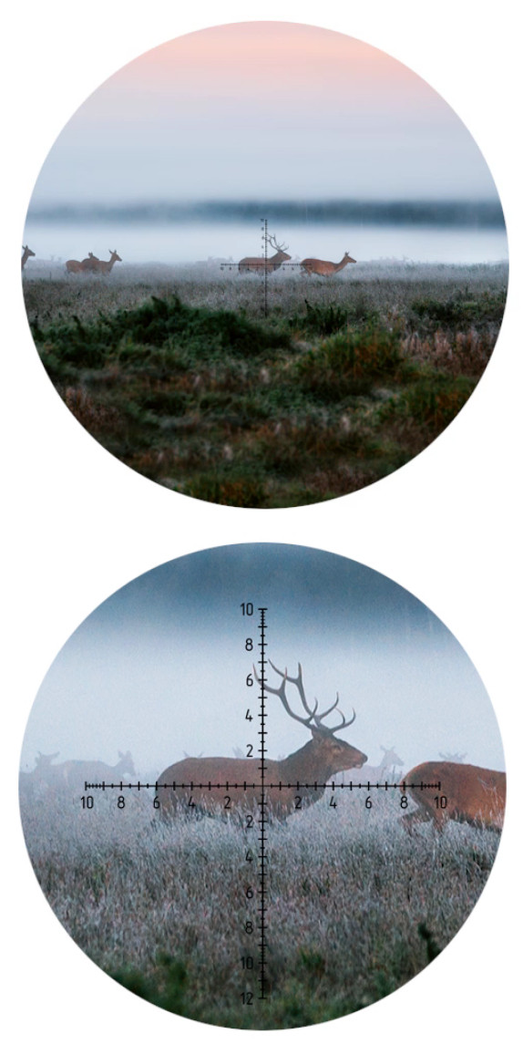 Метка MRH-L2 с центральной частью по типу TMR расположена в 1-й фокальной плоскости (масштабируемая): относительно объекта наблюдения угловые размеры остаются постоянными при любом увеличении. По сетке можно рассчитать расстояние до цели с известной длиной или высотой, или вносить боковые поправки.