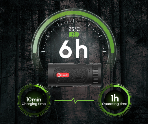 Матрица 256x192 (12 мкм, 50 Гц) с чувствительностью <30 мК позволяет хорошо рассмотреть источник тепла даже в непогоду. Под дождём и в темноте зверя и человека «видит» быстрее и чётче, чем модели Guide TD Gen.II с NETD<50 мК.